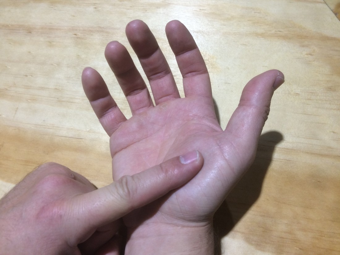 Vamos palpar os músculos anteriores específicos do polegar (Abdutor curto do polegar, Flexor curto do polegar e Adutor do polegar), na zona da mão que em quiromancia se chama Monte de Vénus [estou a usar esta referencia não porque perceba alguma coisa disso, na verdade não tenho formação nenhuma, mas pela facilidade de descrever a zona] ou então para ser mais profissional: músculos que se encontram na zona antero radial do carpo.