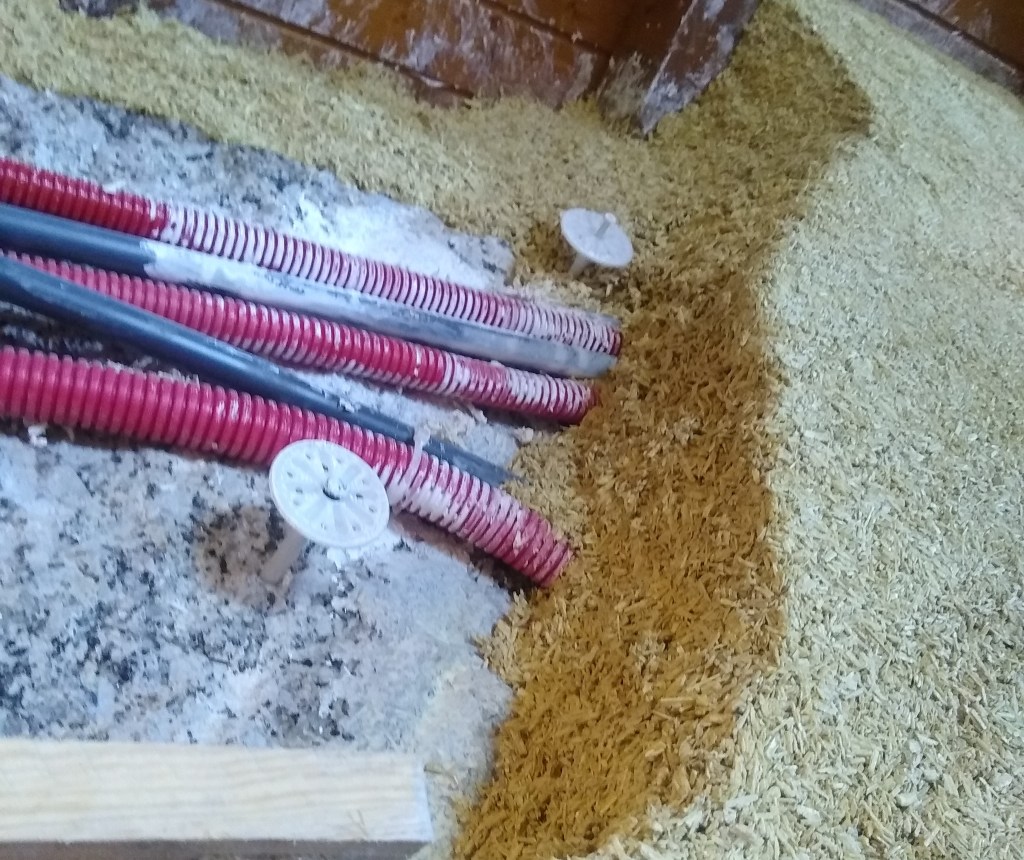 Podemos, se quisermos aplicar cabos, tubos, tomadas, interruptores à posteriori, esburacar a parede feita, instalar ou corrigir. A calha que advém daí cobre com nova massa de cânhamo depois de instalado o que se tem de instalar.